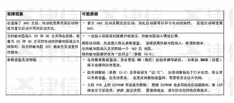 在軟啟動器使用過程中,如果偵測到故障信息,軟啟動器會在日志中記錄相關(guān)信息,還可能跳閘或發(fā)出警告。軟啟動器跳閘后,只有將該軟啟動器復(fù)位才能重新啟動。 如果發(fā)出警告,則一旦消除了警告原因,軟啟動器便會自動復(fù)位。