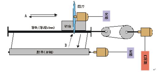 主軸電機用VFD-015M23A驅動,切臺上的圓刀(切刀)用VFD-007M23A驅動,伺服與齒輪同軸相連,通過齒輪皮帶帶動導軌,使切臺在如圖中A所示方向來回移動,用來完成定長的操作。同時切臺通過油壓可以在如圖中B所示方向前后移動,用來對套在主軸上的膠帶進行切割。