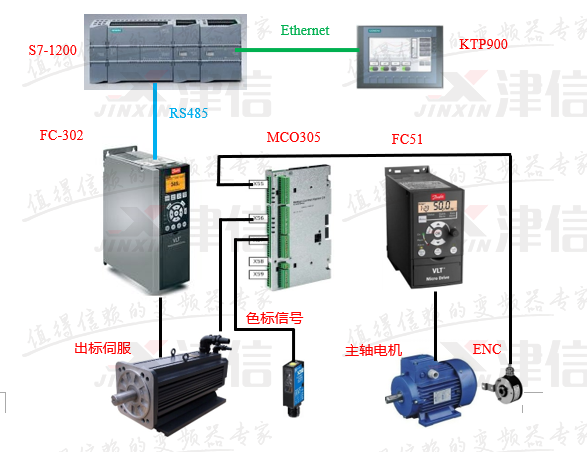 PLC與觸摸屏之間進行Ethernet通訊,PLC與丹佛斯FC302變頻器之間進行RS485通信,通過觸摸屏可以設置標長、對標位置、出標起始位置等工藝參數;FC302變頻器控制出標伺服電機,以保證出標精度及響應精度。
